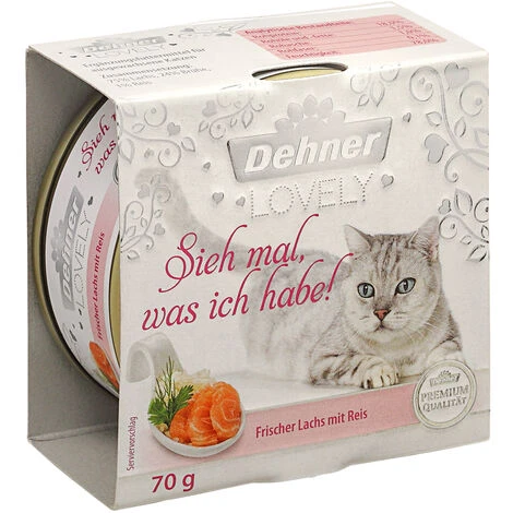 Dehner Premium Lovely Nassfutter Sieh mal, was ich habe! enthält als tierisches Proteinquelle frischen Lachs, der nicht nur besonders delikat, sondern auch sehr gesund ist. Das Lachsfleisch ist reich an wertvollen ungesättigten Omega-3-Fettsäuren, außerdem versorgt es Ihren Liebling mit wichtigen Antioxidantien und den Vitaminen A und D. Und weil der Lachs in Dehner Premium Nassfutter Sieh mal, was ich habe! die einzige Proteinquelle ist, können Sie Ihrem Schmusetiger das Futter auch geben, falls für ihn eine Ausschlussdiät empfohlen wurde.