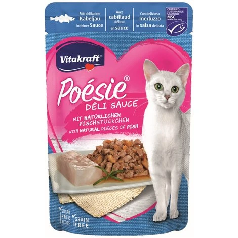 Diese leckeren Häppchen mit delikatem Kabeljau in viel feiner Sauce sind ein wahrer Gaumenschmaus für Ihre Katze und sind unwiderstehlich im Geschmack. Beutel für Beutel enthält Poesie Deli Sauce natürliche, hochwertige Fischstückchen für puren Genuss, den Ihr Stubentiger lieben wird. Beste Zutaten garantieren höchste Qualität und sind ernährungsphysiologisch perfekt auf die Bedürfnisse der Katze abgestimmt. Auch Ihr Liebling wird von dieser Delikatesse nicht genug bekommen können.